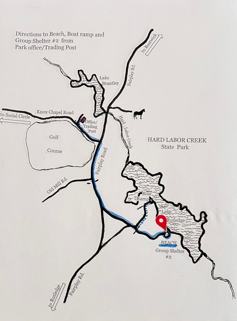 Coming from either direction off I-20, Fairplay Road will take you directly into the little town of Rutledge. Fairplay Road dead ends into the railroad tracks in Rutledge. At this point, there is a jog to the left and then an immediate jog to the right to go over the tracks. You will still be on Fairplay Road and in the center of Rutledge. Continue on Fairplay Road to the park, which is just a couple of miles outside Rutledge.
